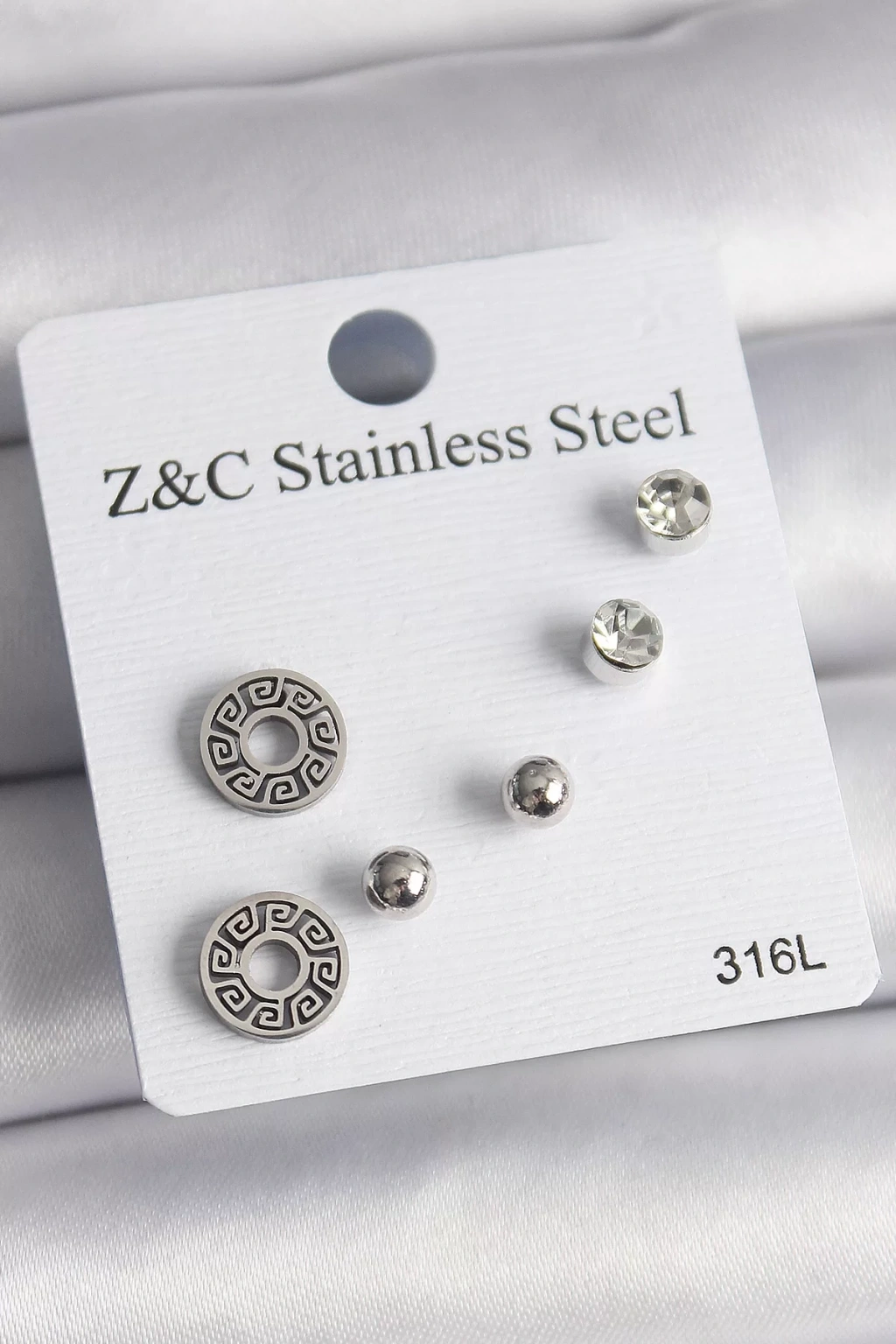 316L Çelik Gümüş Beyaz Renk 3 Boy Yonca Küpe Seti