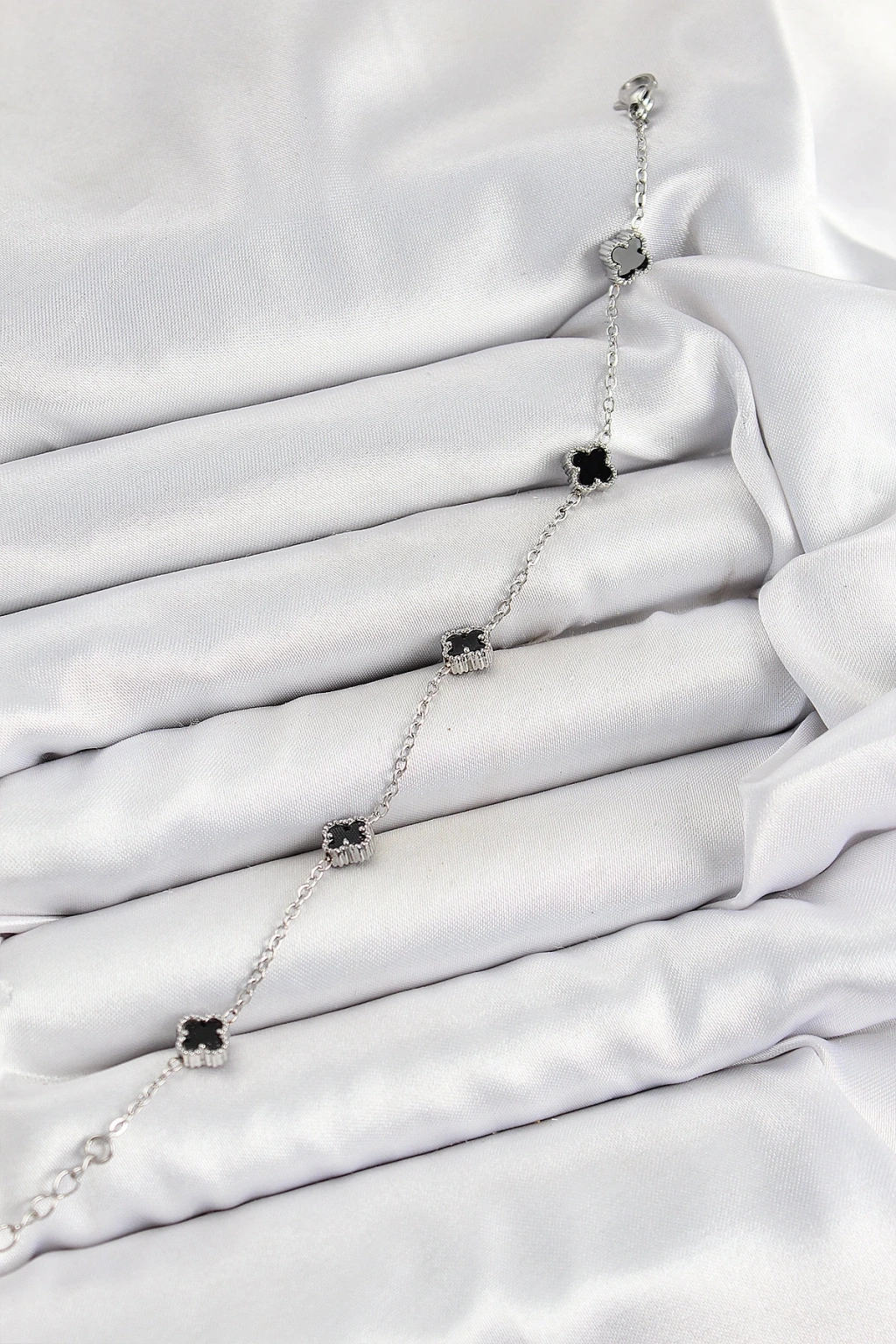 316L Çelik Siyah Sedef Yonca Model Gümüş Renk Kadın Bileklik