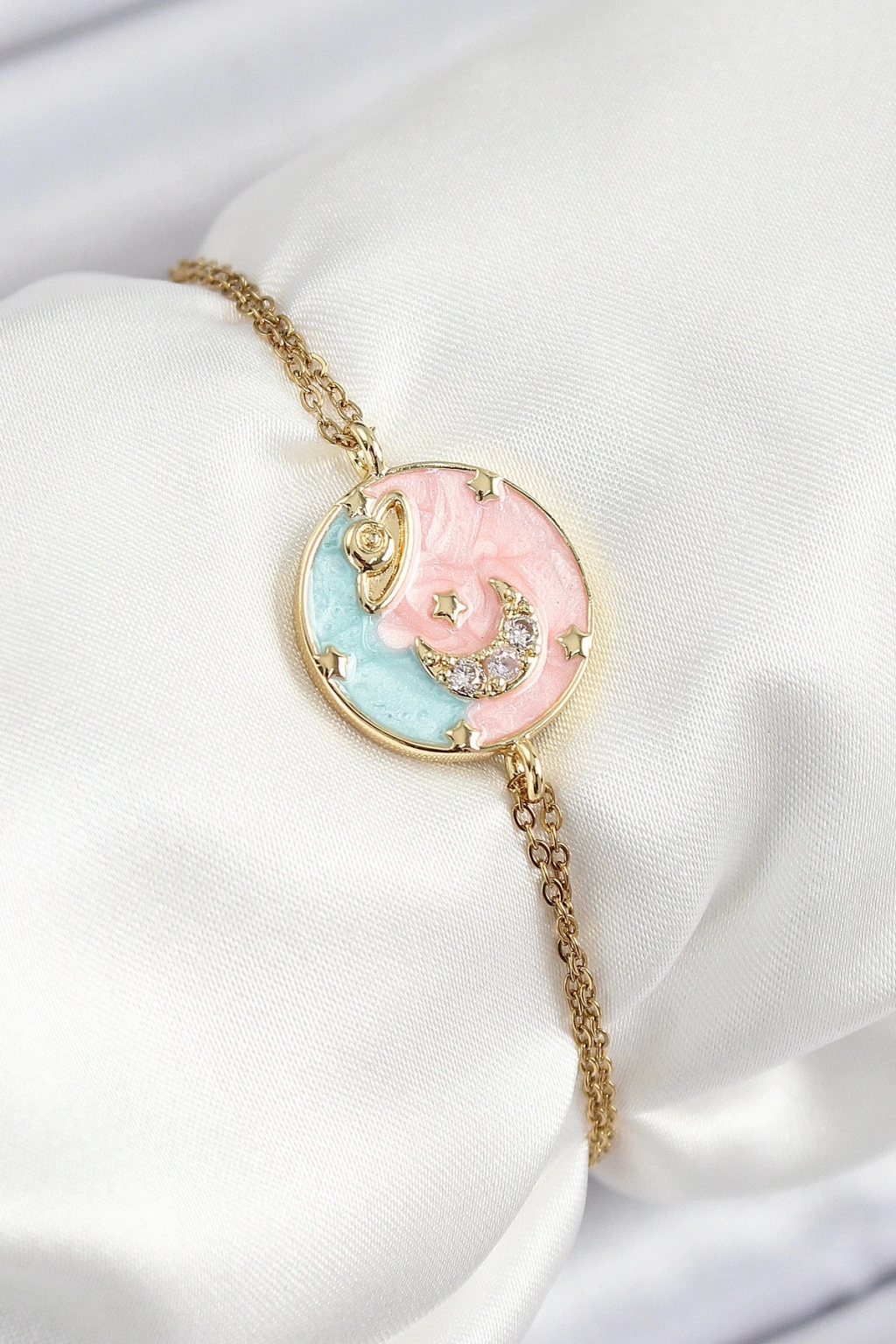 316L Çelik Zincir Mineli Sanatsal Portre Zirkon Taşlı Gezegen Model Gold Renk Kadın Bileklik