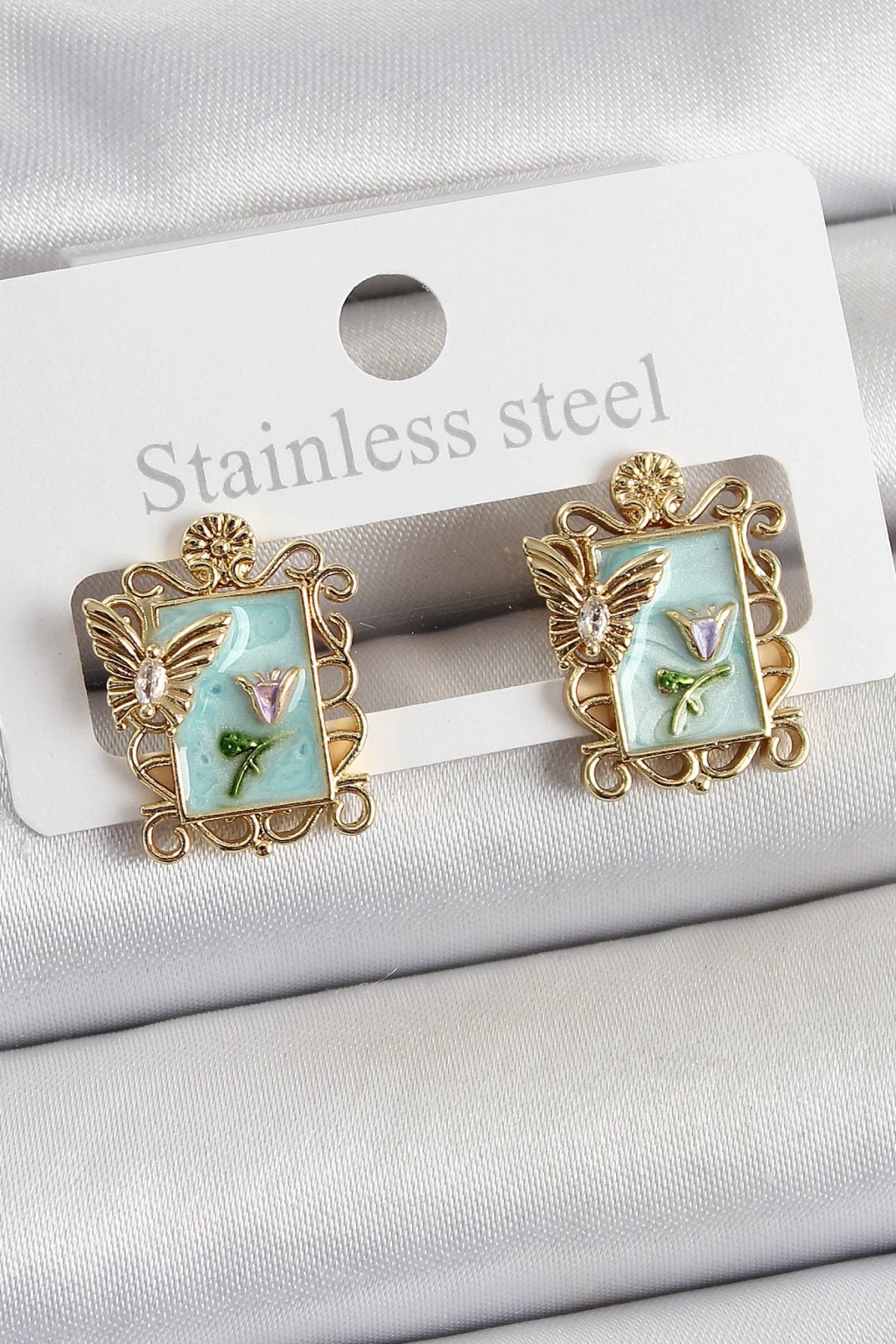 Pirinç Yeşil Mineli Sanatsal Portre Model Gold Renk Kadın Küpe