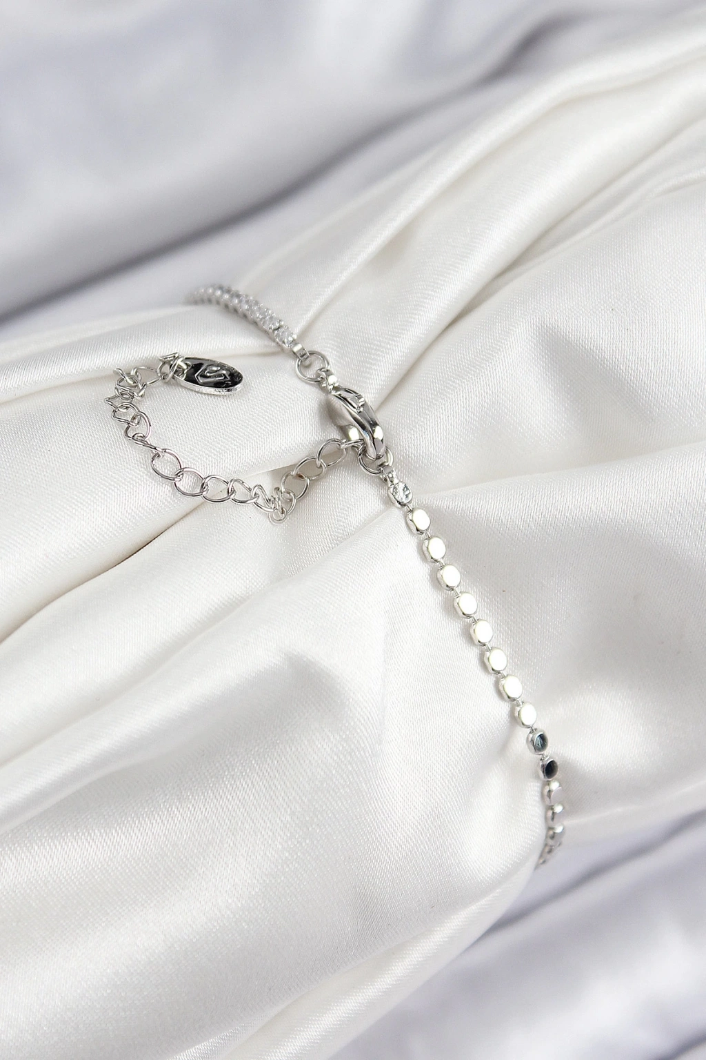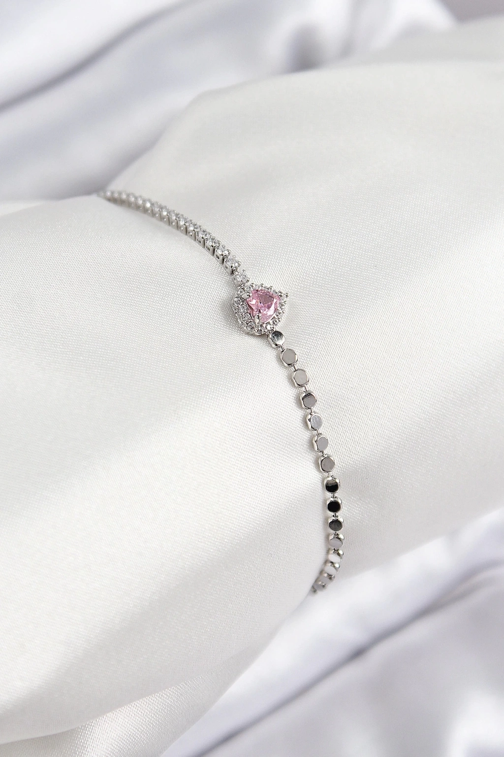 Pirinç Zirkon Taşlı Kalp Model Ezme Zincir Gümüş Renk Kadın Bileklik