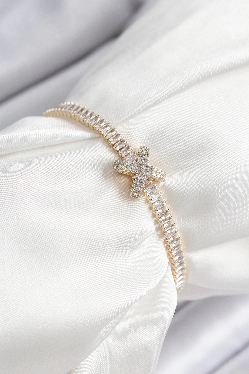 Pirinç Zirkon Taşlı X Detaylı Su Yolu Model Gold Renk Asansörlü Kadın Bileklik