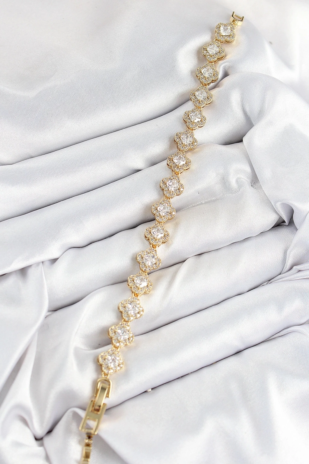 Pirinç Zirkon Taşlı Yonca Baget Model Gold Renk VIP Seri Kadın Bileklik