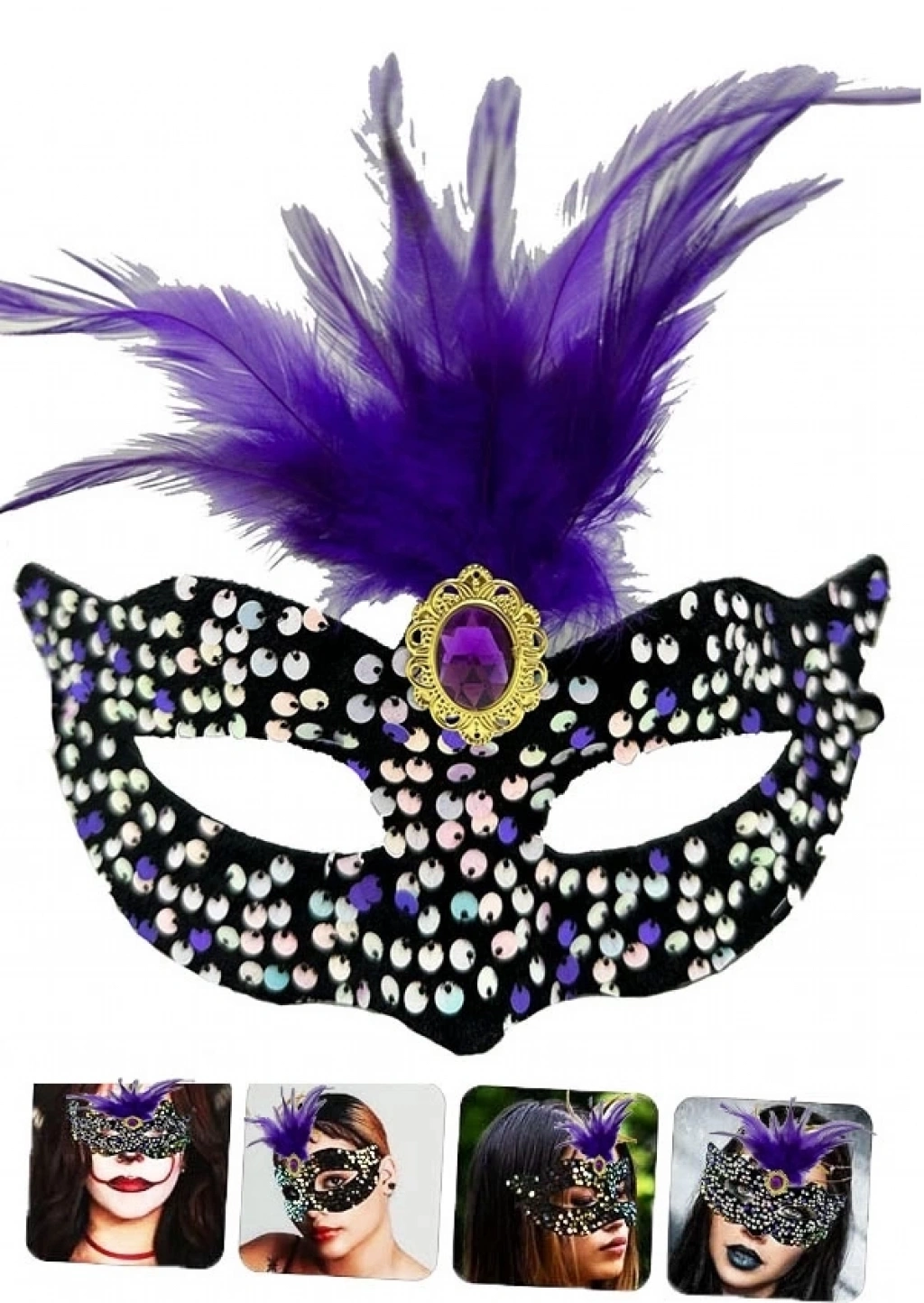• Mor tüyler ve mor taşlar maskeye lüks ve göz alıcı bir görünüm kazandırır.