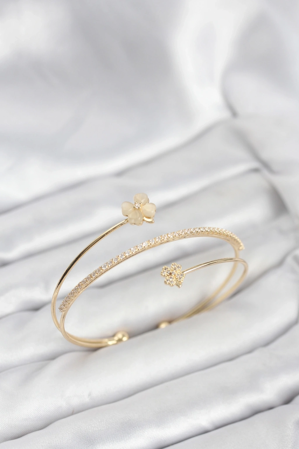 Yonca Çiçek Model Pirinç Gold Renk Kadın Bileklik